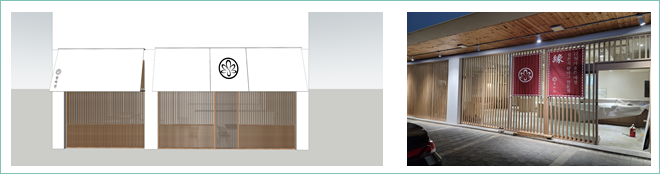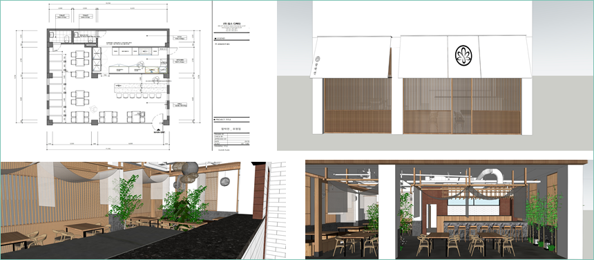 이렇게 수정을 해드렸더니 아주 만족을 하셨지만 그래도 전면 파사드 부분이 조금 약하다고 하셨던 것 같습니다. 그래서 저희 조이사가 일본풍이 나도록 자재비와 인건비가 많이 들어가지만 전면 파사드에 간살과 필름마감을 하기로 하였습니다.