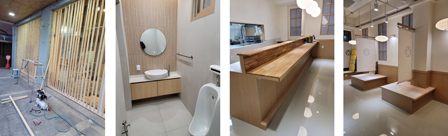 전면에 힘을 실어 힘들지만 간살로 모두 마무리하여 공사를 진행하였고요, 화장실 디자인에 신경을 많이 쓰셨기에 기존 화장실에 문제가 없었지만 모두 리뉴얼 해 드렸고요, 바 설치는 고객과 조리 및 서빙이 가능하게 최대한 디테일하게 높이를 맞춰 진행해 드렸습니다.