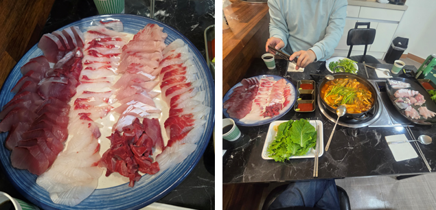 어때요?? 잘 하셨나요? 초보치고는 잘 하셨다고 칭찬해 드렸습니다. 나름 특수부위에 칼집 넣는 것도 알고 계셨고요, 연습 잘 하시는 것 같았습니다. 일부는 이렇게 하였고, 원래는 초밥용 네타 뜨는 것까지 진행하였어야 했는데 시간이 너무 길어지고 함께 오신 지인분도 계셔서 횟감 선도 떨어지기 전에 즐겁게 식사하고 오늘 교육은 마무리 하기로 하였습니다.