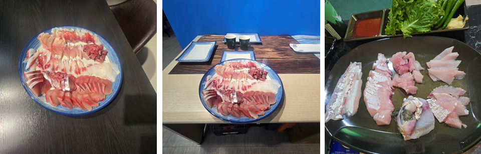 이론적으로 많이 알고 오셔서 교육시 제가 크게 할것은 자세 교정과 잘못된 방식을 잡아 주는것입니다. 영상으로는 본인들이 배우거나 하는 방식을 알려 드리는데 사실 본인 체형이나 본인의 편한 자세에 따라서 영향이 있는데 이를 잡아 주지 못했더니 몇가지 잘못 되어 있었습니다. 생선의 뱃살 부위는 원통형이 사실 벗기기가 어려운 부분입니다. 이날도 실수를 하셨는데 그것은 경력자들도 쉽지는 않아요, 그래서 횟집에서는 탈피기를 쓰기도 합니다. 이제 회를 어떻게 뜨셨나 확인을 한번 해 보겠습니다.